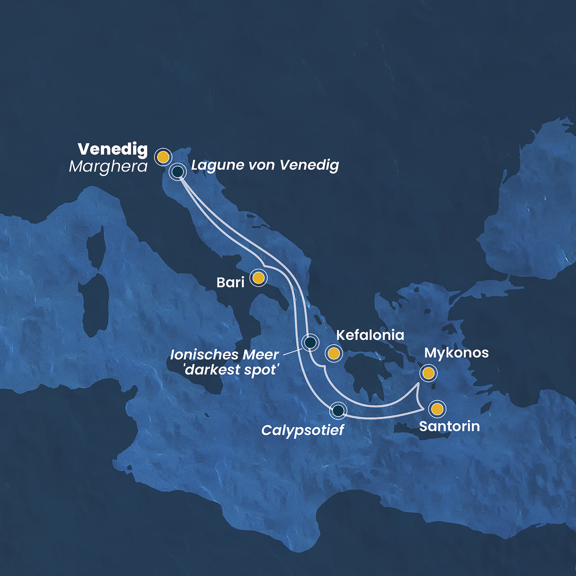 Begeben Sie sich auf eine traumhafte Reise vom Adriatischen Meer mit den italienischen Städten Marghera und Bari, über das Ägäische Meer mit Santorin und Mykonos nach Griechenland mit Kefalonia im Ionischen Meer.