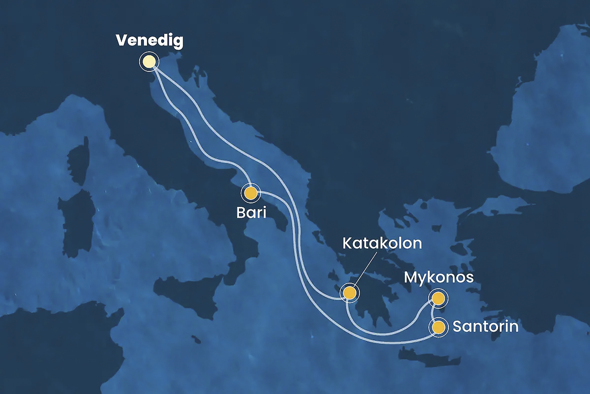 Begeben Sie sich auf eine traumhafte Reise vom Adriatischen Meer mit den italienischen Städten Marghera und Bari, über das Ägäische Meer mit Santorin und Mykonos nach Griechenland mit Katakolon im Ionischen Meer.