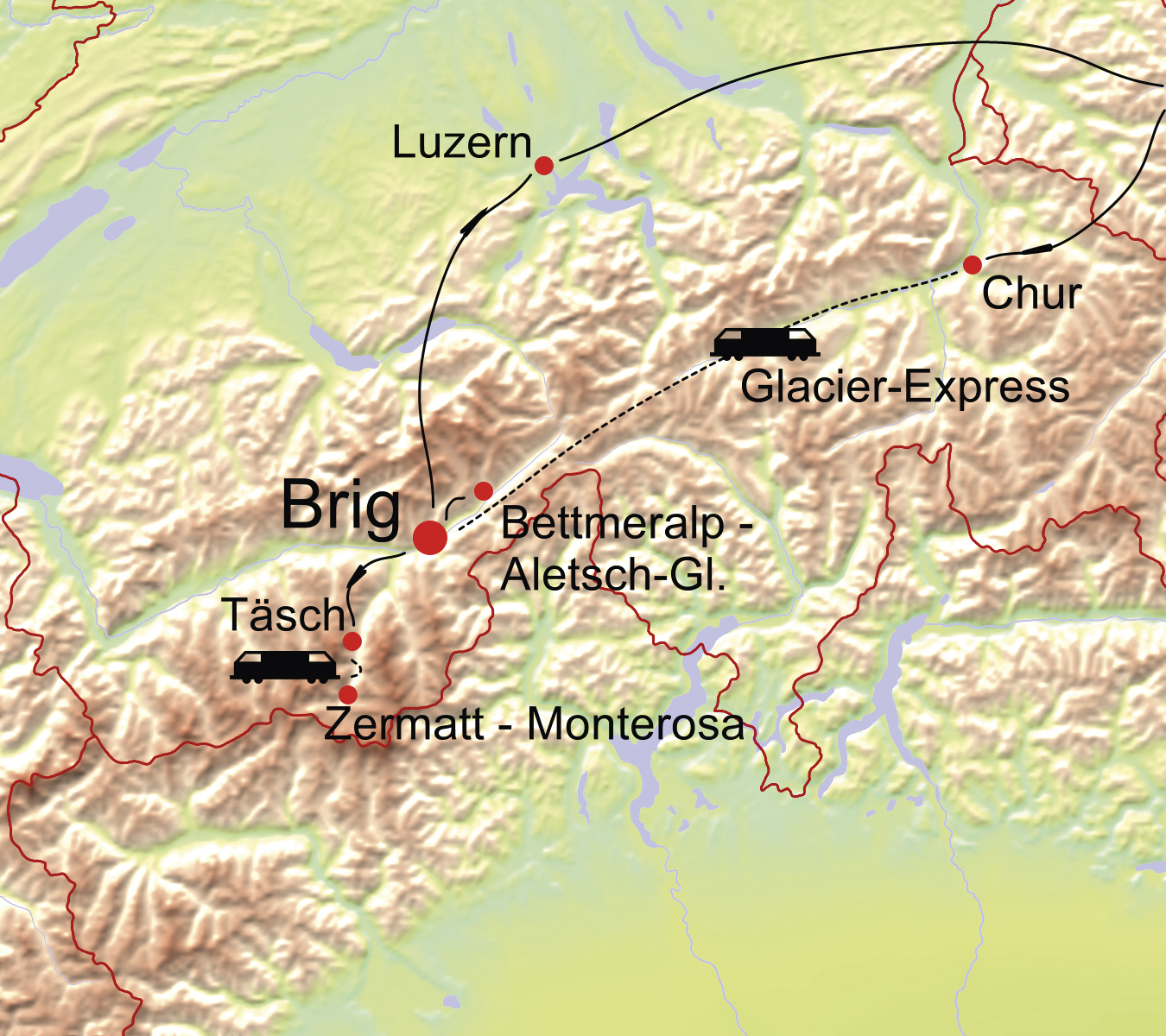 Abfahrt 6.00 Uhr Augsburg – Landsberg – Memmingen – Lindau – Chur. Von Chur reisen Sie auf einer landschaftlich besonders attraktiven Strecke mit dem Glacier-Express bis Brig, wo Sie Ihr Hotel beziehen. Am späteren Nachmittag unternehmen Sie in Brig noch einen Stadtrundgang durch den malerischen Hauptort des Oberwallis. 3-Sterne-Hotel