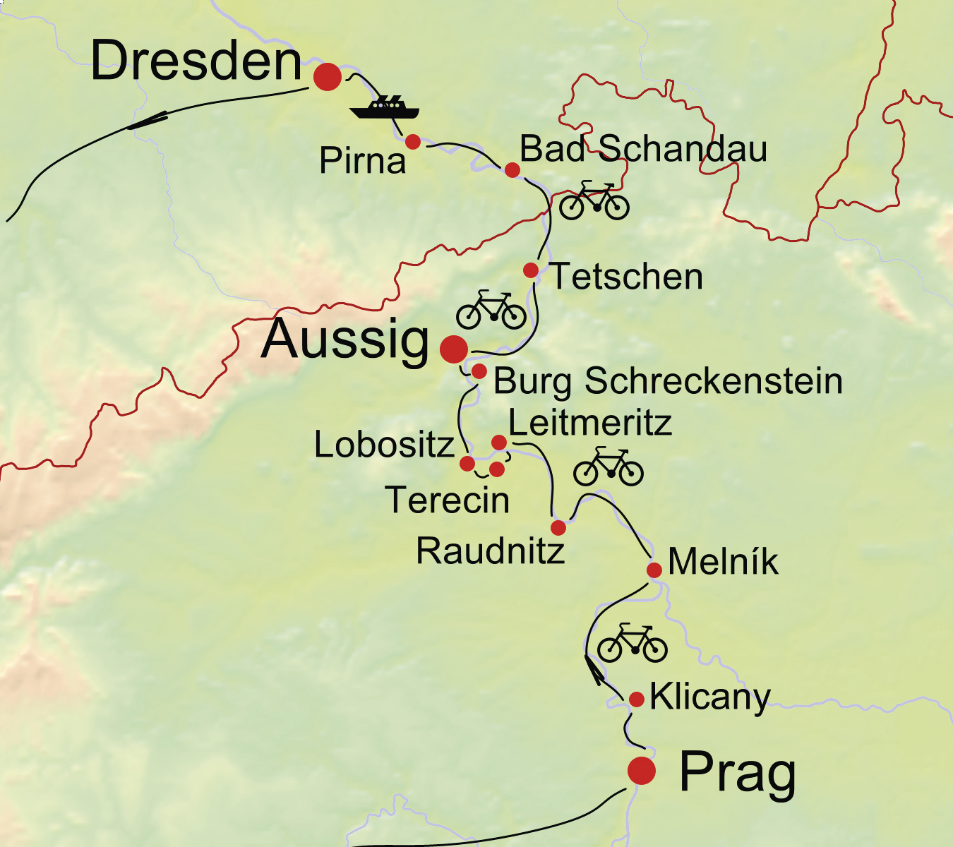 Auf schönen Routen geht es über Raudnitz entlang der Elbe in die Königsstadt Leitmeritz am Fuße des böhmischen Mittelgebirges. Danach fahren Sie über Theresienstadt mit der bedeutenden Gedenkstätte nach Lobositz. Von dort folgt der Radweg der Elbe vorbei an Burg Schreckenstein bis Aussig. 4-Sterne-Hotel