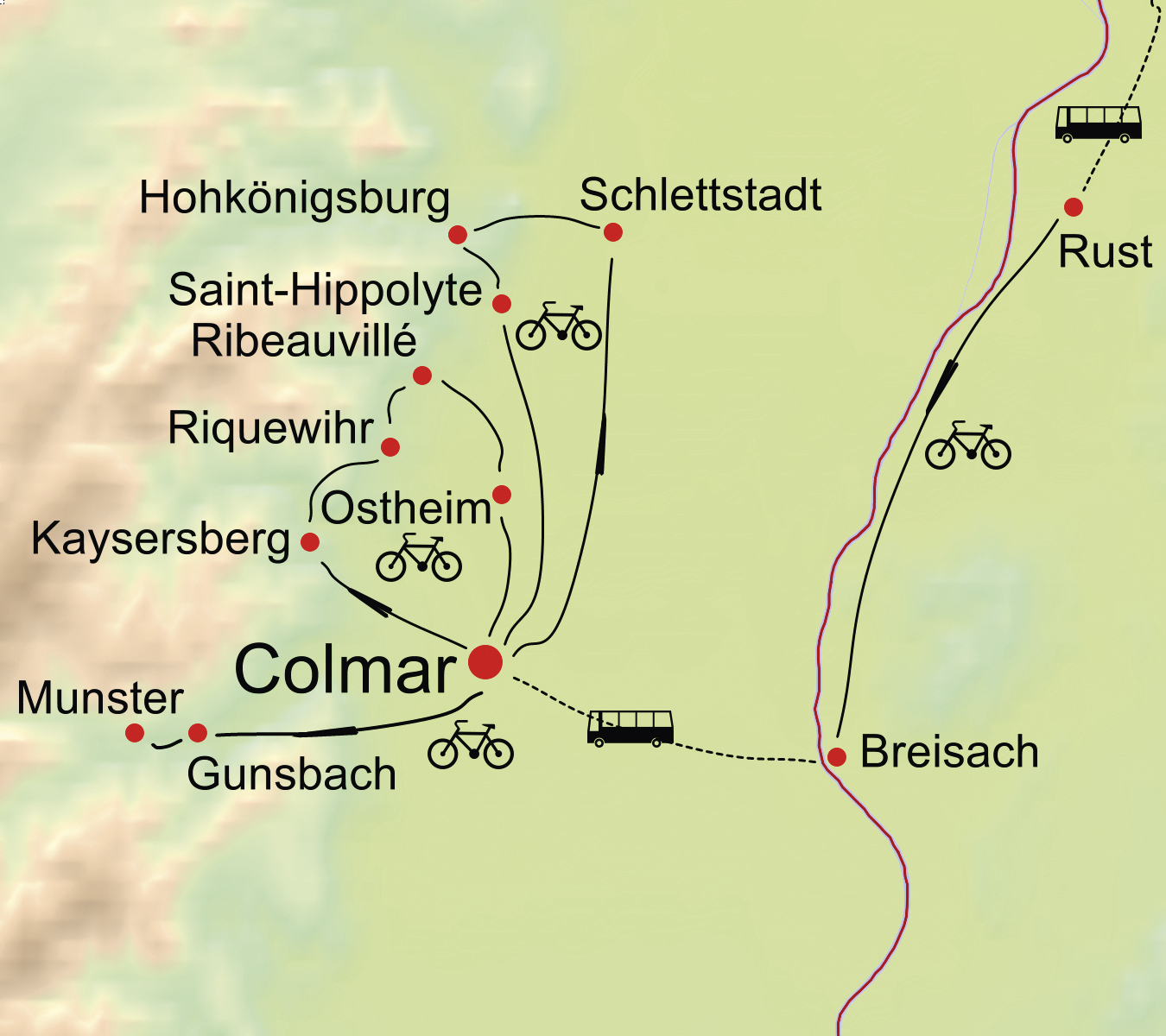 Durch Felder und kleine Ortschaften und oft entlang des Wasser fahren Sie vom Hotel aus inRichtung Norden bis Sie den Ill-Wald bei Schlettstadt erreichen. In Schlettstadt können Sie sich beieinem kleinen Mittagessen stärken, bevor Sie den Anstieg zur Hohkönigsburg in Angriff nehmen. Oben genießen Sie den Blick auf die Burg und das Umland mit den Weinbergen. Anschließendfahren Sie hinab ins kleine Weindorf Saint-Hippolyte. Genießen Sie zwischen den Fachwerkhäusern ein Glas regionalen Wein, bevor Sie mit dem Bus wieder zurück ins Hotel gebracht werden.