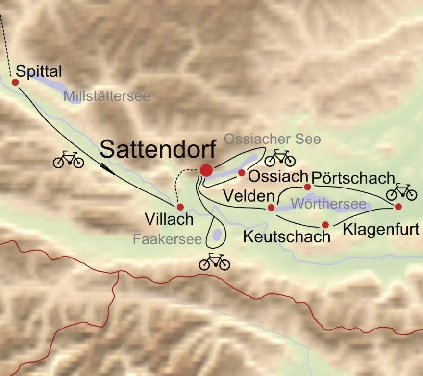 Das 3-Sterne-superior-Hotel Sonnenhügel (Landeskat. 4 Sterne) liegt auf der Sonnenseite des Ossiacher Sees im malerischen Ort Sattendorf. Der See ist fußläufig zu erreichen. Die großzügige Sonnenterrasse, zwei Saunen mit Relaxraum sowie der Swimmingpool bieten genug Gelegenheiten, nach den Radtouren zu entspannen. Das Schlemmerfrühstück sowie das mehrgängige Abendmenü mit Vorspeisen- und Salatbuffet lassen keine kulinarischen Wünsche offen. Alle Zimmer verfügen über Bad oder Dusche/WC, Sat-TV und Safe.