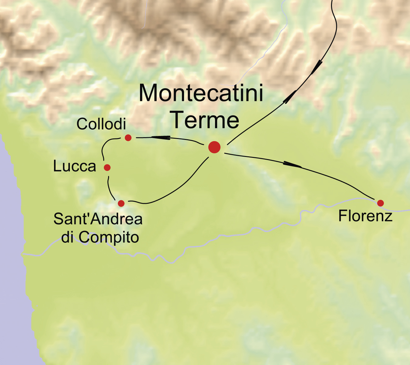 Heute entdecken Sie die blumigen Seiten der Toskana. Zunächst besuchen Sie den Garten der Villa Garzoni in Collodi. Bewundern Sie die kunstvoll angelegten Blumenbeete, Treppen und Terrassen sowie die verschlungenen Wege, die zu Wasserfällen, versteckten Statuen, Grotten und einem Irrgarten führen. Besuchen Sie auch das Schmetterlingshaus mit seinem üppigen Tropengarten und zahlreichen Schmetterlingen aus aller Welt. Dann fahren Sie nach Lucca, der Geburtsstadt Puccinis mit seiner baumbewachsenen Stadtmauer. Hier haben Sie Gelegenheit zum Mittagessen und Bummeln. Am Nachmittag besuchen Sie den kleinen Ort Sant´Andrea di Compito, wo Sie bei der Kamelienschau viele Kamelienarten bewundern können. Hier am Ort sollen sich die ältesten Kamelien Italiens befinden. Sie haben auch die Möglichkeit zum Besuch der Villa Orsi, wo Sie baumhohe und zum Teil sehr alte Kamelien erwarten (Im Ort geht es z. T. bergauf. Gutes Schuhwerk notwendig.).