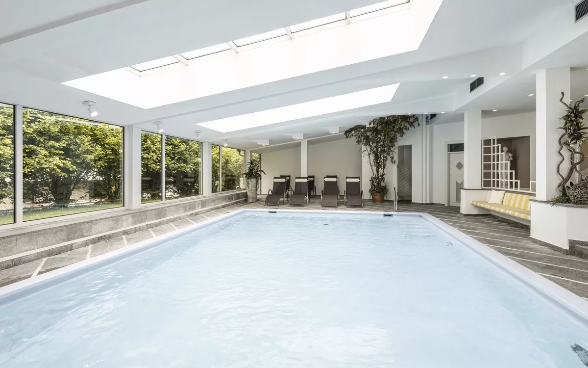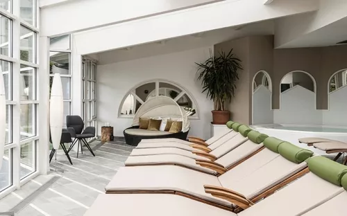 700 m² großen Badelandschaft mit Indoor-Pool, finnischer Sauna, Kräutersauna und römischem Dampfbad sowie Fitnessraum und Bella & Serena