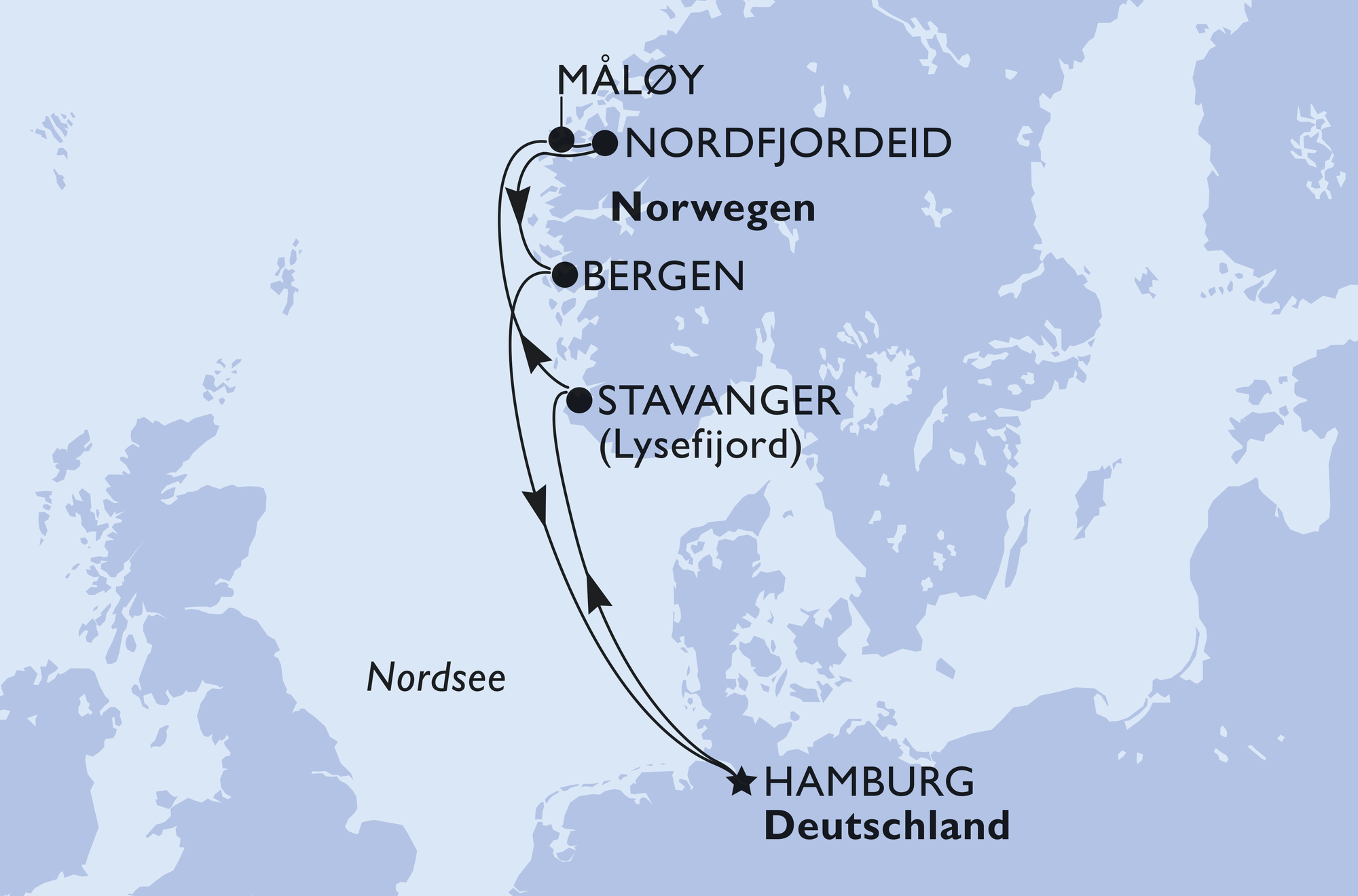 mit Stavanger / Lysefijord, Måløy, Nordfjordeid und Bergen
