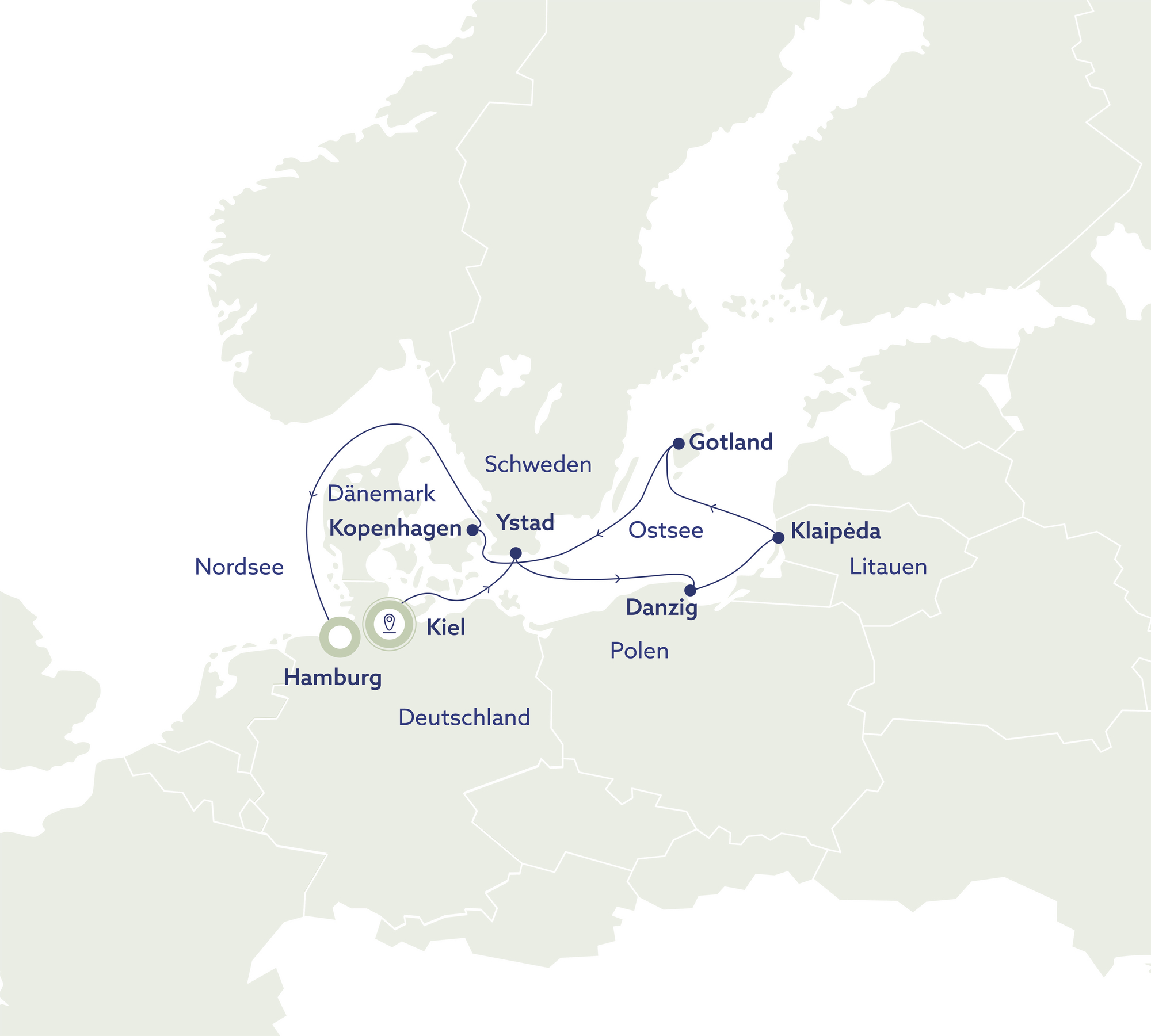 von Kiel über Ystad, Danzig, Klaipeda, Visby, Kopenhagen nach Hamburg