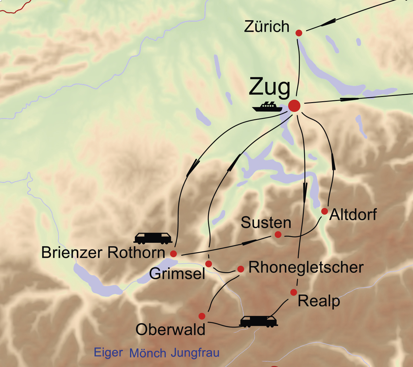 Heute geht es zum Vierwaldstätter See und auf der berühmten Axenstraße nach Realp. Hier startet die Fahrt mit der Furka-Dampfbahn nach Oberwald. Die Panoramastrecke führt auf den Furka-Scheitelpunkt gegenüber dem Rhônegletscher, wo Sie Zeit für einen Fotostopp haben. In Oberwald angekommen, geht es mit dem Bus zum Aussichtspunkt Belvédère direkt am Rhônegletscher. Sie können hier die Eisgrotte besuchen (Eintritt nicht inkl., ca. € 10 p. P.). Zurück geht es über den Grimselpass nach Innertkirchen. Wer möchte, kann hier eine kurze Wanderung durch die Aareschlucht machen (1,5 km, festes Schuhwerk empfohlen). Anschließend fahren Sie vorbei am Luganersee und Alpnacher See zurück nach Zug.