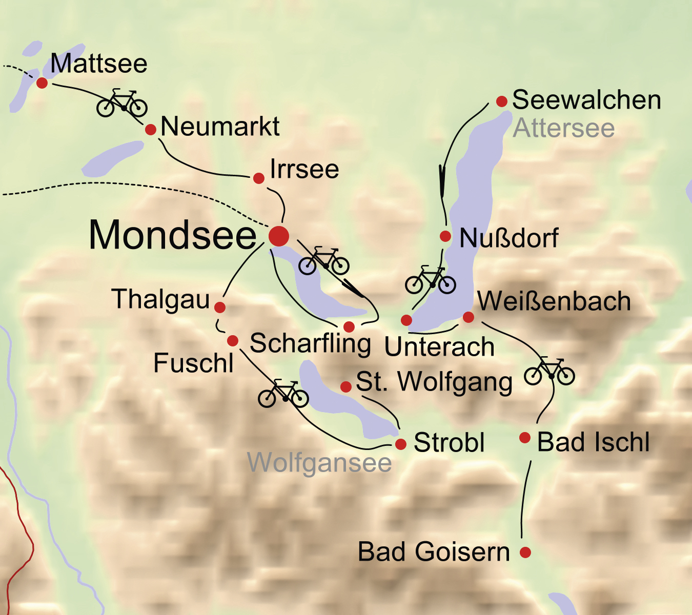 Abfahrt 06.00 Uhr Augsburg – 07.10 München/Fröttmaning – Rosenheim – Salzburg – Mondsee. Eingebettet zwischen Schafberg, Mondseeberg und Drachenwand liegt Mondsee. Vom Hotel aus beginnt Ihre erste Rad-Etappe - Sie starten die Tour rund um den Mondesee entlang des Ostufers bis nach Au und radeln dann mit Blick auf die Drachenwand über Scharfling, St. Lorenz und Schwarzindien wieder zurück nach Mondsee. Anschließend werden Sie in Ihrem 4-Sterne Hotel Prielbauer mit einem stärkenden Abendessen erwartet.