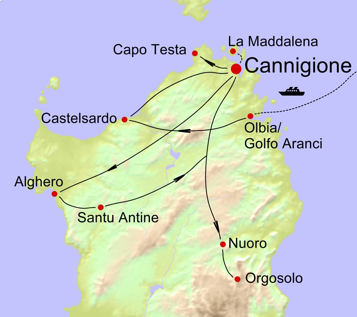 Abfahrt 5.00 Uhr Augsburg – 6.00 Uhr München/Fröttmaning – Landsberg – Brenner – Verona – Livorno. Einschiffung an Bord der Fähre nach Sardinien.
