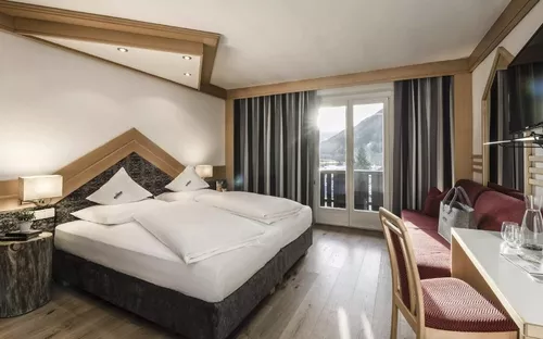 70 Zimmer (gegen Aufpreis Superior-Zimmer), Lift, WLAN im ganzen Haus, großzügige Aufenthaltsräume und Hotelbar im alpenländischen Stil, Speisesaal.