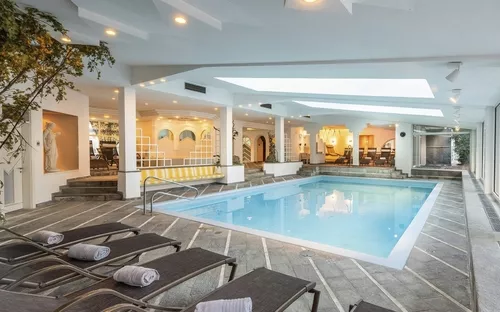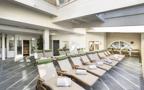 700 m² großen Badelandschaft mit Indoor-Pool, finnischer Sauna, Kräutersauna und römischem Dampfbad sowie Fitnessraum und Bella & Serena Spa.