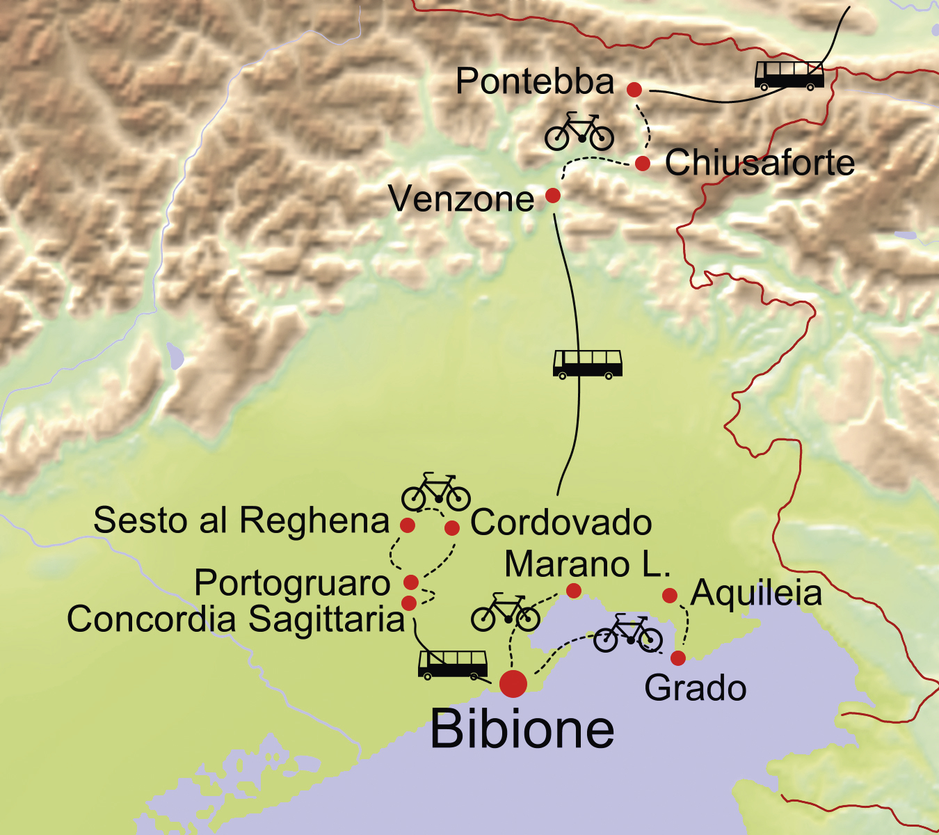 Abfahrt 6.00 Uhr Augsburg – 7.10 Uhr München/Fröttmaning – Salzburg – Villach – Pontebba: Gegen Mittag starten Sie Ihre erste Radtour auf einer der schönsten Radstrecken Italiens. Die Potebbana führt über eine alte, asphaltierte Bahnstrecke entlang spektakulärerer Täler und Berge von Pontebba nach Venzone. Dann bringt Sie Ihr Reisebus über Udine nach Bibione. Am Nachmittag werden Sie von Ihrem örtlichen Rad-Guide Giovanni mit einem Willkommens-Aperitif und Informationen zu den Radtouren in der Lagune im Hotel San Michele begrüßt. 4-Sterne-Hotel