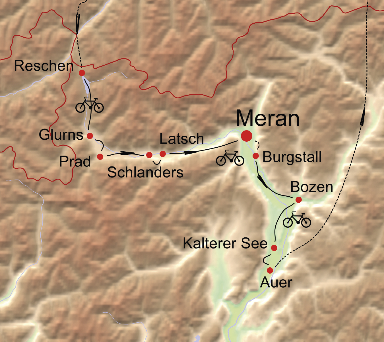 Von Latsch startet Ihre Radtour auf der Via Claudia zuerst nach Kastelbell und folgt dann dem Radweg über Naturns und Partschins nach Meran. Über Burgstall radeln Sie nun Richtung Bozener Becken. Lohnenswert ist ein Abstecher nach Terlan zur Kirche Mariä Himmelfahrt mit sehenswerten Fresken. Dann erwartet Sie in Bozen Ihr Reisebus; nutzen Sie die Zeit noch zu einem Bummel durch die Laubengänge oder zum Waltherplatz. Transfer nach Meran.