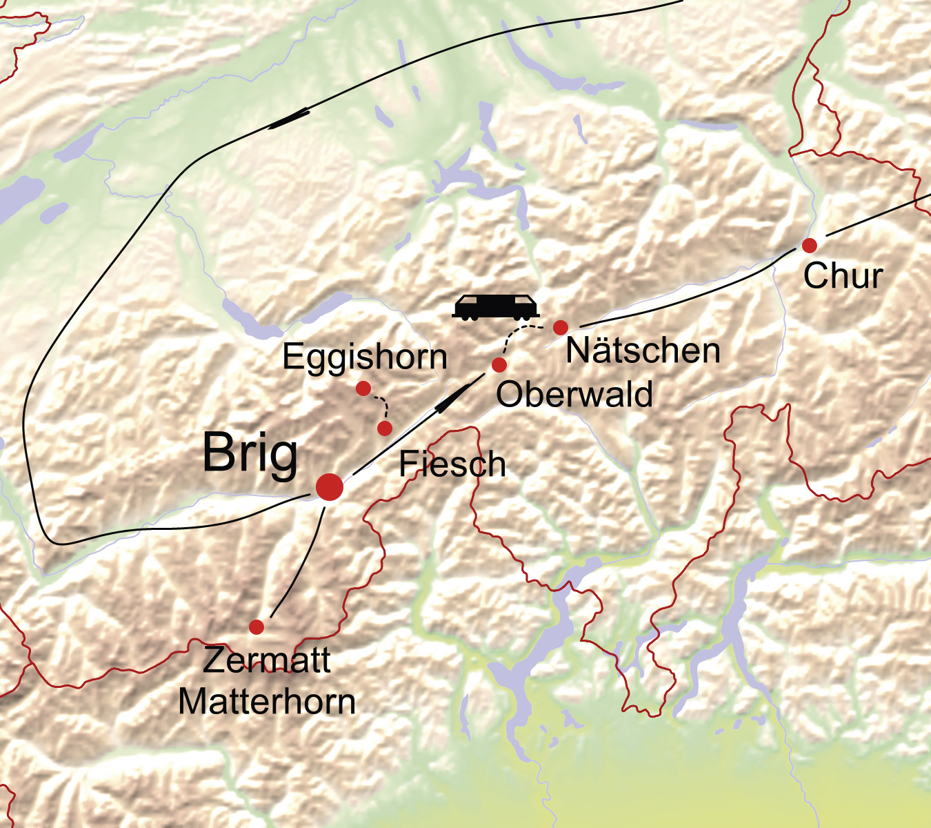 Abfahrt 7.00 Uhr Augsburg – Landsberg – Memmingen – Lindau – Zürich – Bern – Lausanne – Martigny. Durch das Rheintal gelangen Sie nach Brig im Wallis.