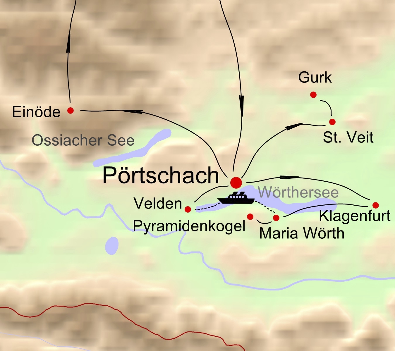 Heute steht eine ganztägige Wörthersee-Rundfahrt auf dem Programm, die mit dem Besuch von Klagenfurt beginnt, auch „Renaissance-Juwel am Wörthersee“ genannt. Überragend im wörtlichen Sinne ist der Pyramidenkogel; vom 100-Meter hohen Aussichtsturm haben Sie die ganze Region im Blick (Eintritt nicht inkl.: € 13,60 mit Wörtherse Premium Card). Dann besuchen Sie nahc kurzer Fahrt den Wallfahrtsort Maria Wörth mit seiner eindrucksvollen Kirche. Nach einer informativen Kirchenführung geht es mit dem Schiff nach Velden, wo das berühmte Schlosshotel gelegen ist; am Nachmittag kehren Sie nach Pörtschach zurück.