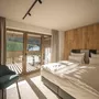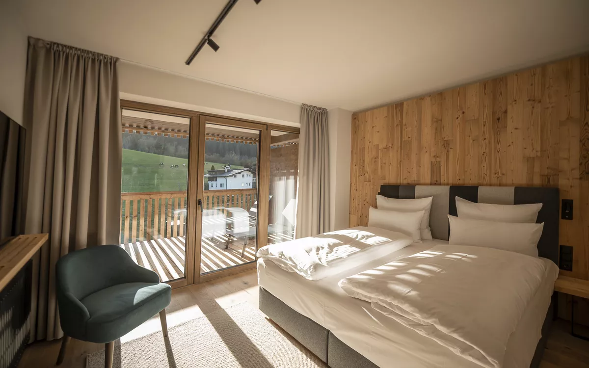 Harmonisch ausgestattete Zimmer mit edlen Materialien, Bad mit Dusche/WC, Föhn, Balkon mit spektakulärem Ausblick, Boxspringbett, Echtholzboden, Badetasche mit Saunatüchern, Slippern und Bademänteln. Suite Premium sind etwas größer, mit seperatem WC.