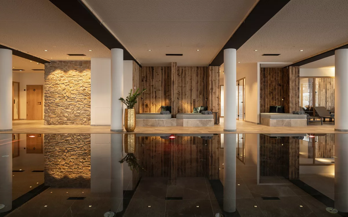 Spa-Area mit stilvollem Indoorpool, Panoramasauna, sanfte Sauna, Saunenaufgüsse, Infrarotkabine, schöne Ruheräume.