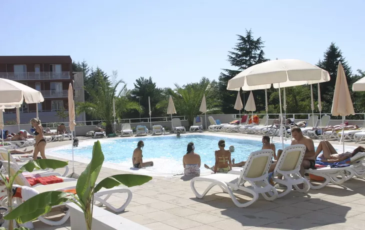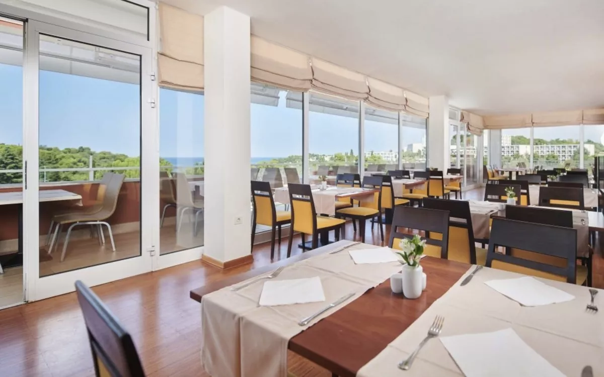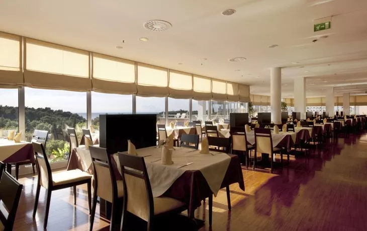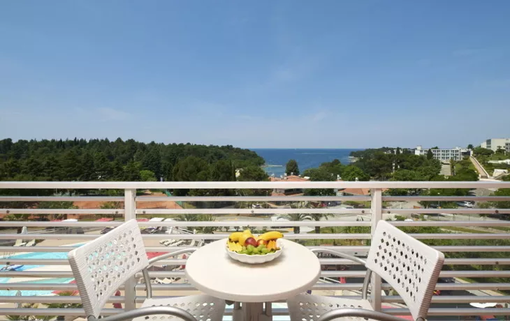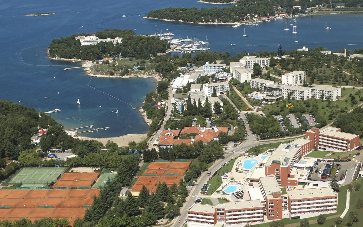 5 km südlich von Porec, in der Ferienanlage Zelena Laguna, auf einer Anhöhe ca. 150 m vom Kies- und naturbelassenem Felsstrand mit Badeplateaus und Liegewiesen entfernt. Minibahn und Schiff zum Zentrum gegen Gebühr.