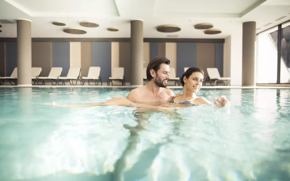 Wellnessbereich/Spa auf 1600 m², großer Innen- und Außenpool, Finnische Sauna, Bio-Kräutersauna, Infrarotkabine, Dampfbad, Sole-Ruheraum.