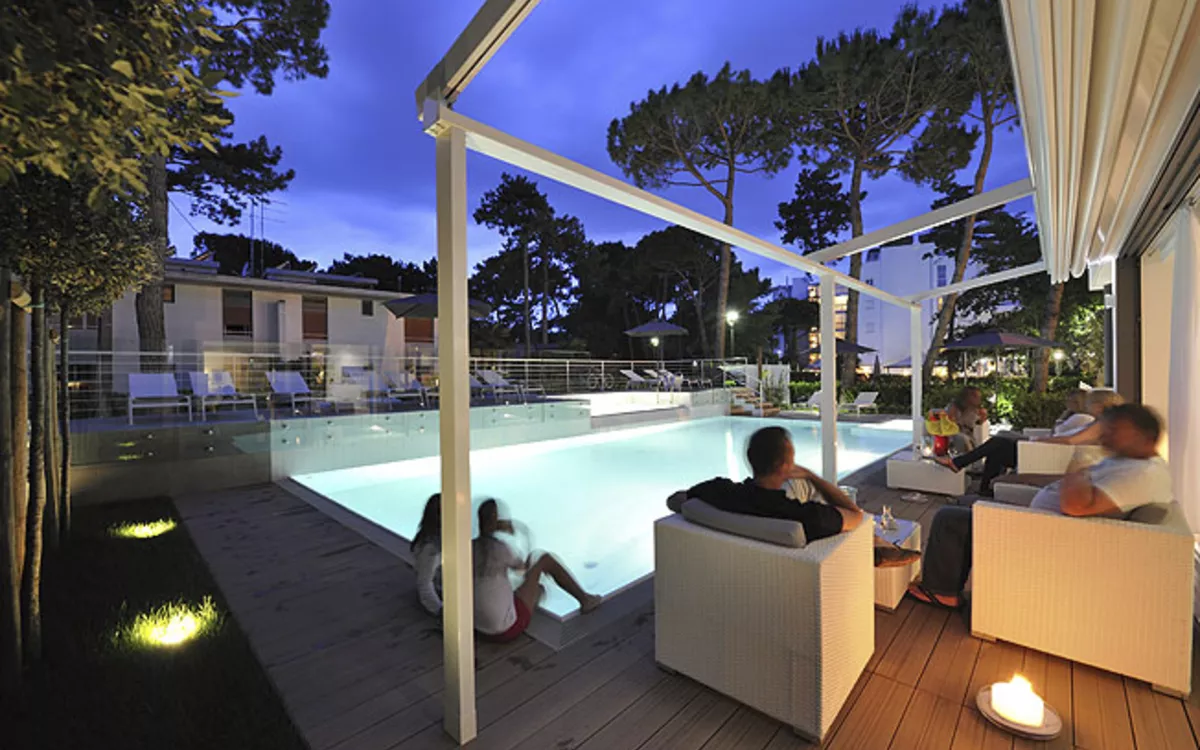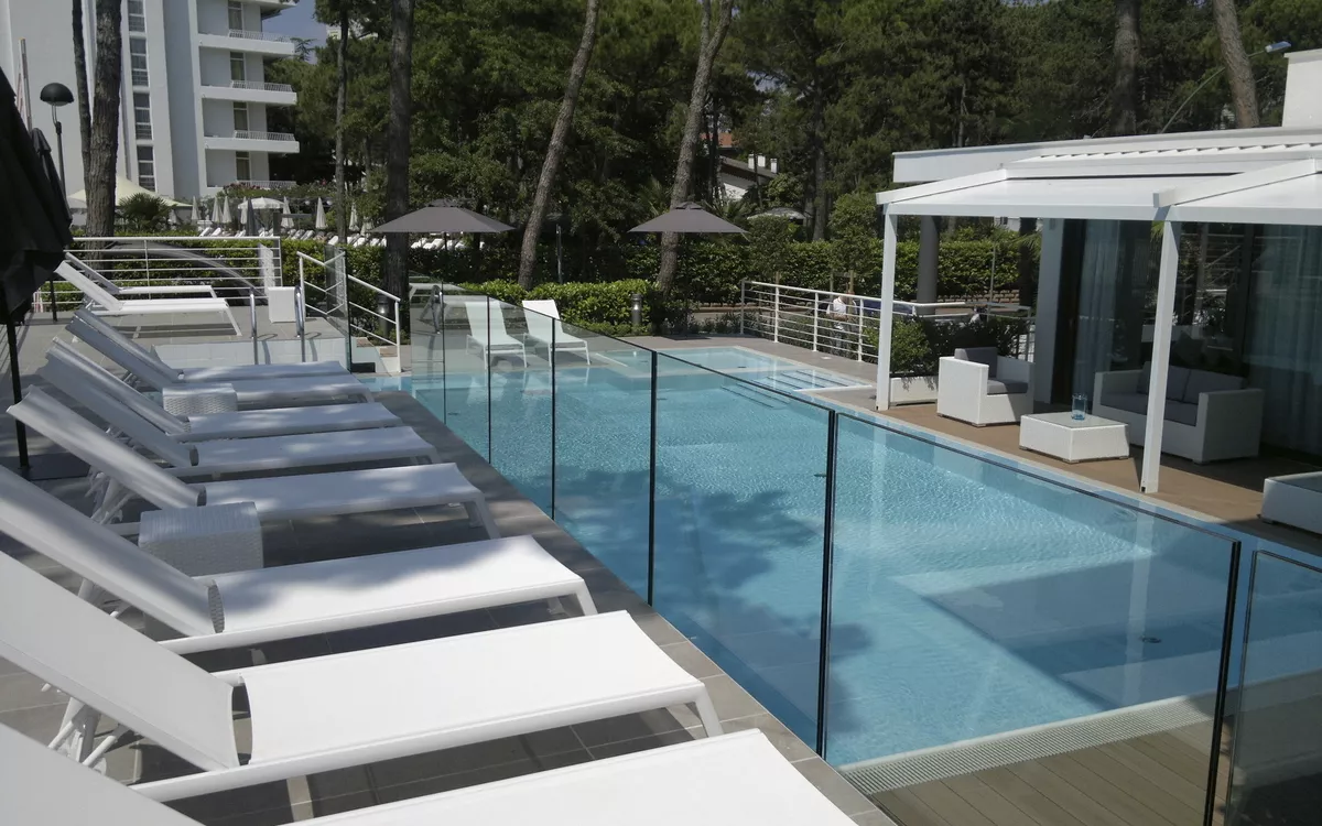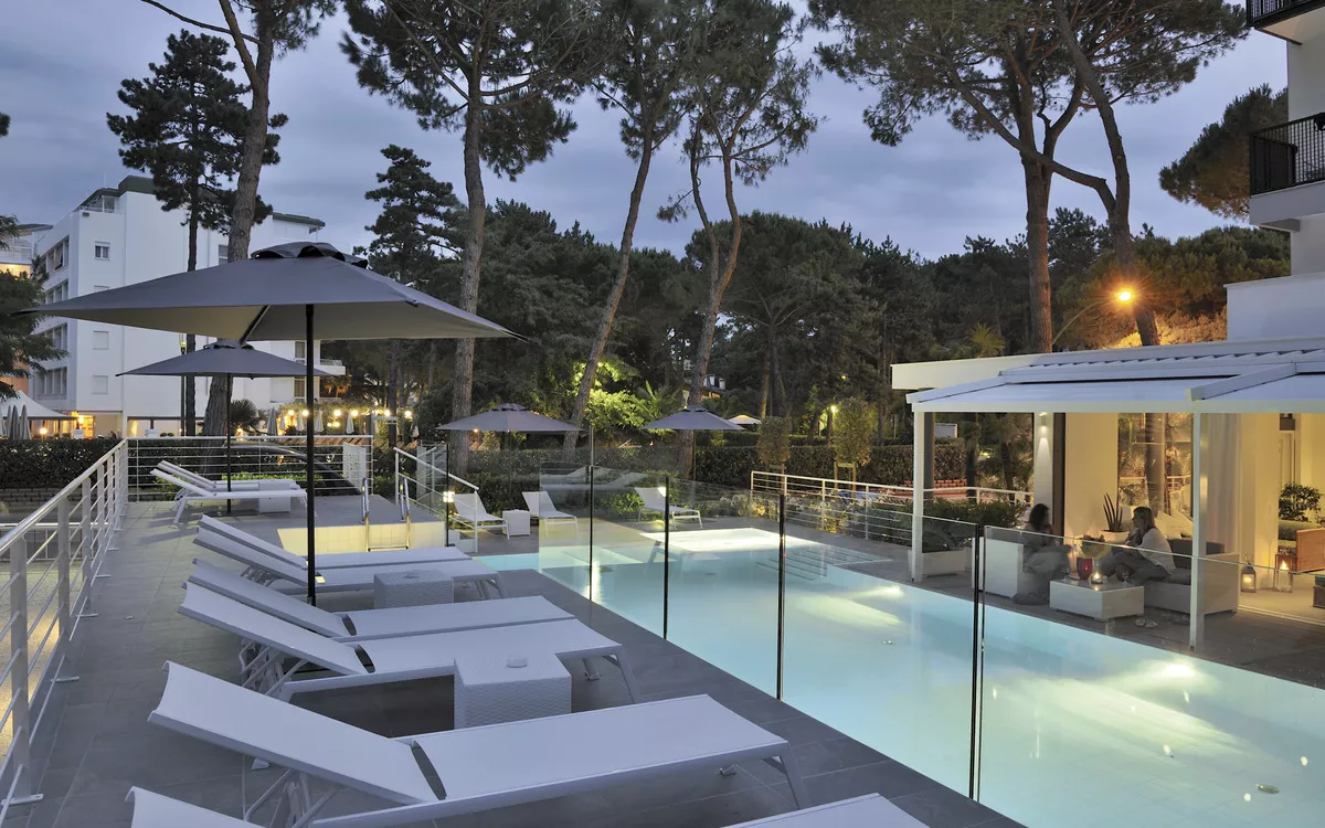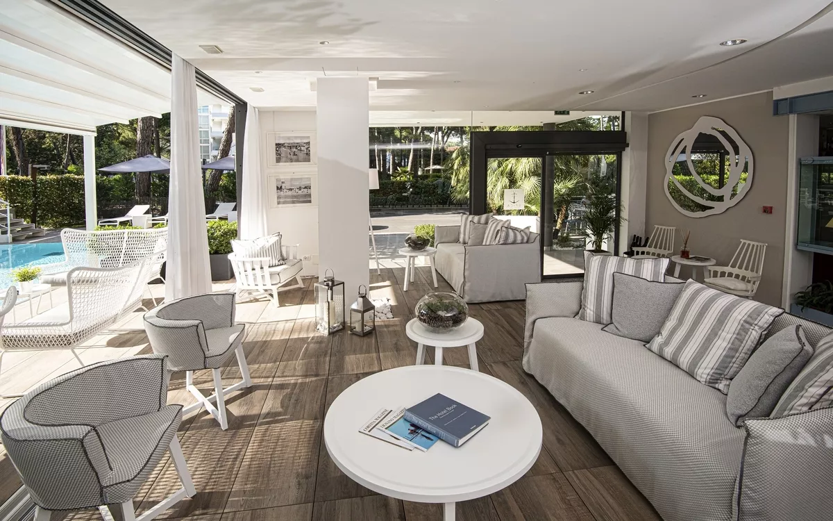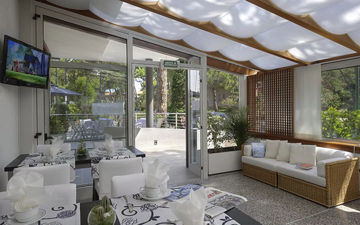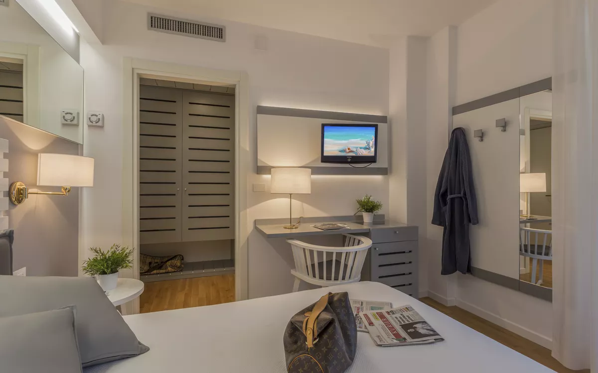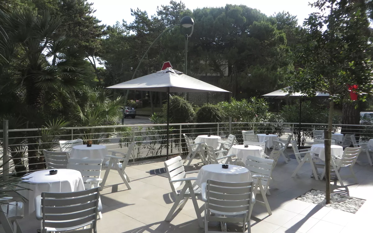 Vom Besitzer persönlich geführt, 2021 renoviert, 40 Zimmer, Lift, Terrasse mit Bar, neue Frühstücksterrasse im Garten, TV-Raum, Wlan, neue Relaxzone mit kleinem Fitnessbereich (2023), Swimmingpool mit Kinderbecken und Whirlpool, Sonnenterrasse, 2 Liegen und 1 Sonnenschirm am Strand inklusive. Örtl. Kat. 4 Sterne.
